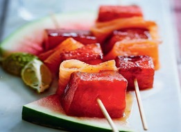 Ces brochettes sont parfaites au début d'un repas d'été ou pour accompagner un apéritif. Les cubes de pastèque doivent être assez gros afin de ne pas fondre lors du passage à la poêle et de garder leur fraîcheur. Le saumon peut être remplacé par de la viande séchée de grison ou du jambon cru dégraissé.