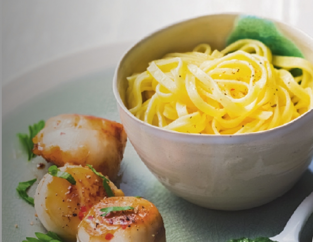 Ce plat est à préparer à partir de novembre, quand les coquilles Saint-Jacques sont abondantes. Toute l’année, vous trouverez des Saint-Jacques surgelées pour un prix très raisonnable. Notez que les 6 carrés de sucre sont contenus dans les tagliatelles, les Saint-Jacques seules contiennent 0 carré de sucre.