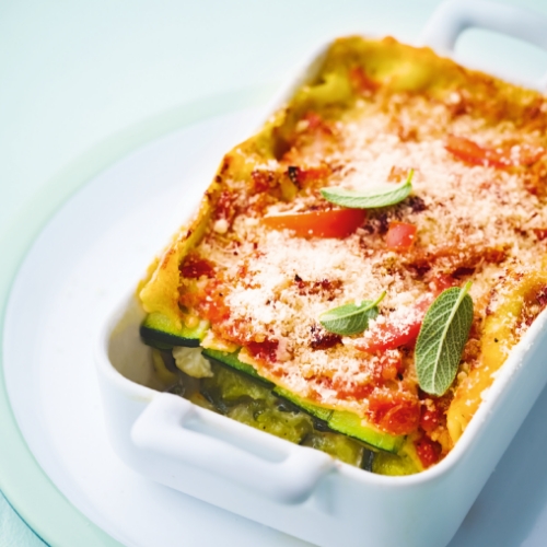 3. Étalez 2 cuillerées de sauce dans un plat à gratin rectangulaire. Déposez-y une couche de lasagnes. Recouvrez d’une couche de légumes (sans les tomates) en les arrangeant selon votre choix, ajoutez un peu de ricotta, puis saupoudrez-les de parmesan et recouvrez d’une couche de sauce. Recouvrez d’une autre couche de lasagnes, et recommencez l’opération jusqu’à épuisement des ingrédients. Terminez par les tomates et le reste de parmesan. Ajoutez un filet d’huile d’olive et faites cuire 1 heure au four. Laissez reposer 10 minutes avant de servir.
