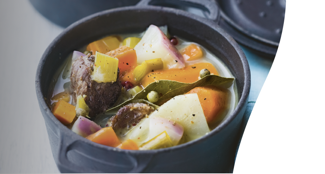 4. Au bout de 2 heures de cuisson, ajoutez le céleri-rave, les patates douces et le chou. Laissez encore frémir 30 minutes ou jusqu’à ce que la viande soit tendre. Ajoutez alors les blancs de poireau attachés en botte et laissez encore cuire 15 minutes.