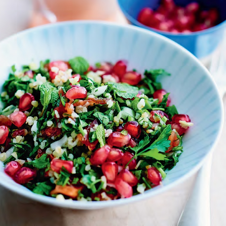 6. Mélangez les ingrédients délicatement, salez et rectifiez l'assaisonnement. Disposez le taboulé dans un plat de service, parsemez-le des graines de grenade, et servez immédiatement.