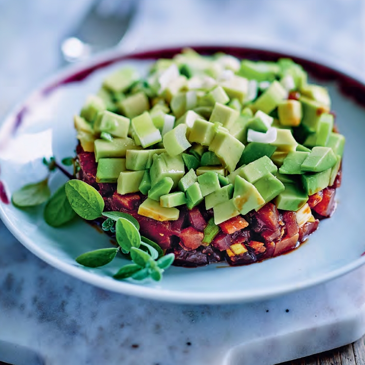 L'avocat ajoute un supplément de couleur et une texture onctueuse, mais ce tartare de thon peut aussi être préparé sans avocat. C'est surtout le gingembre qui lui donne son originalité et sa fraîcheur.