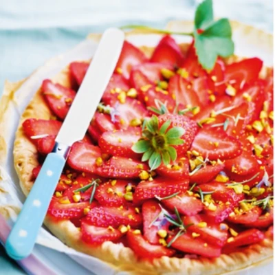 4. Lavez et équeutez les fraises, coupez-les en tranches de 3 à 4 mm dans le sens de la longueur. Disposez-les rapidement sur le fond de tarte comme les tuiles d’un toit, parsemez des amandes ou des pistaches grillées et de quelques petites feuilles de romarin ou de thym si vous aimez ça. Vous pouvez saupoudrer d’un peu de sucre glace, mais pas trop afin de ne pas dénaturer le goût des fraises. Servez immédiatement.