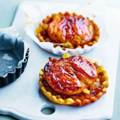 5. Étalez la pâte à tarte le plus finement possible. Garnissez-en 4 moules à tartelette. Placez une demi-pomme dans chaque fond de tartelette, arrosez du reste de sirop et recouvrez de petits dés de gingembre confit. Terminez la cuisson au four à 180 °C pendant 20 minutes, jusqu’à ce que les bords de la pâte soient dorés. Servez tiède ou froid.